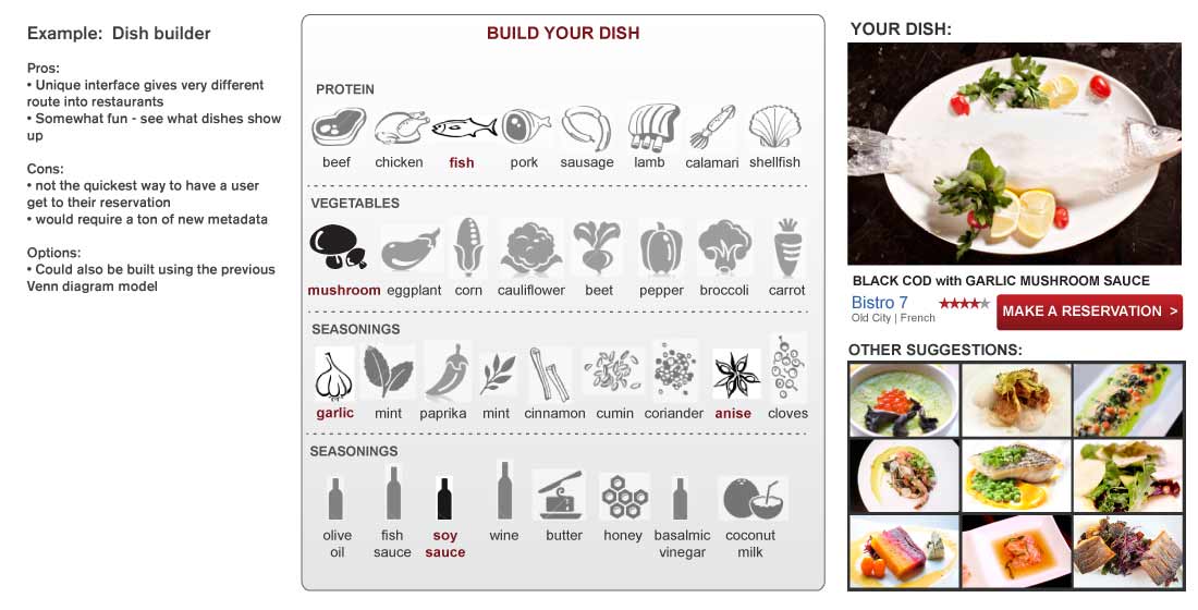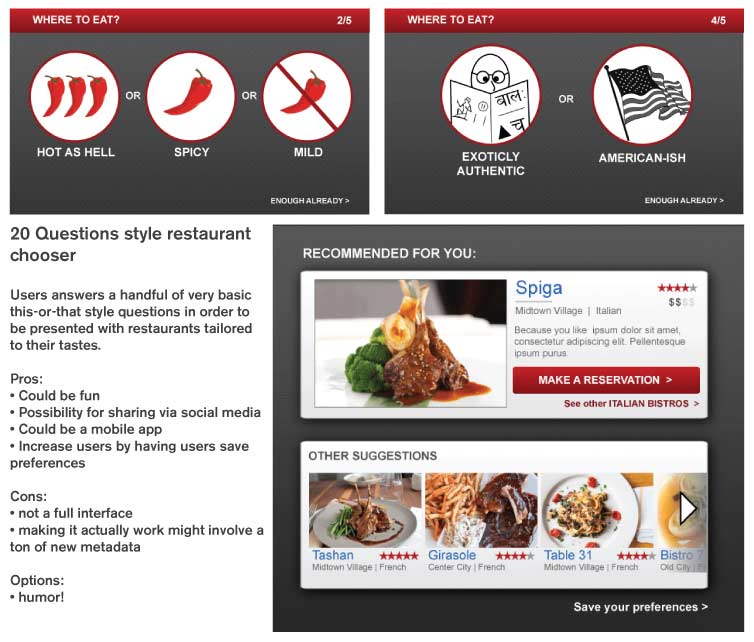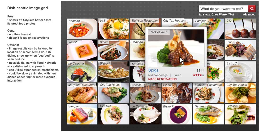 The design challenge was to generate a creative app/widget for Food Network's CityEats website. Research indicated that people use one set of tools to discover restaurants and another to make reservations.