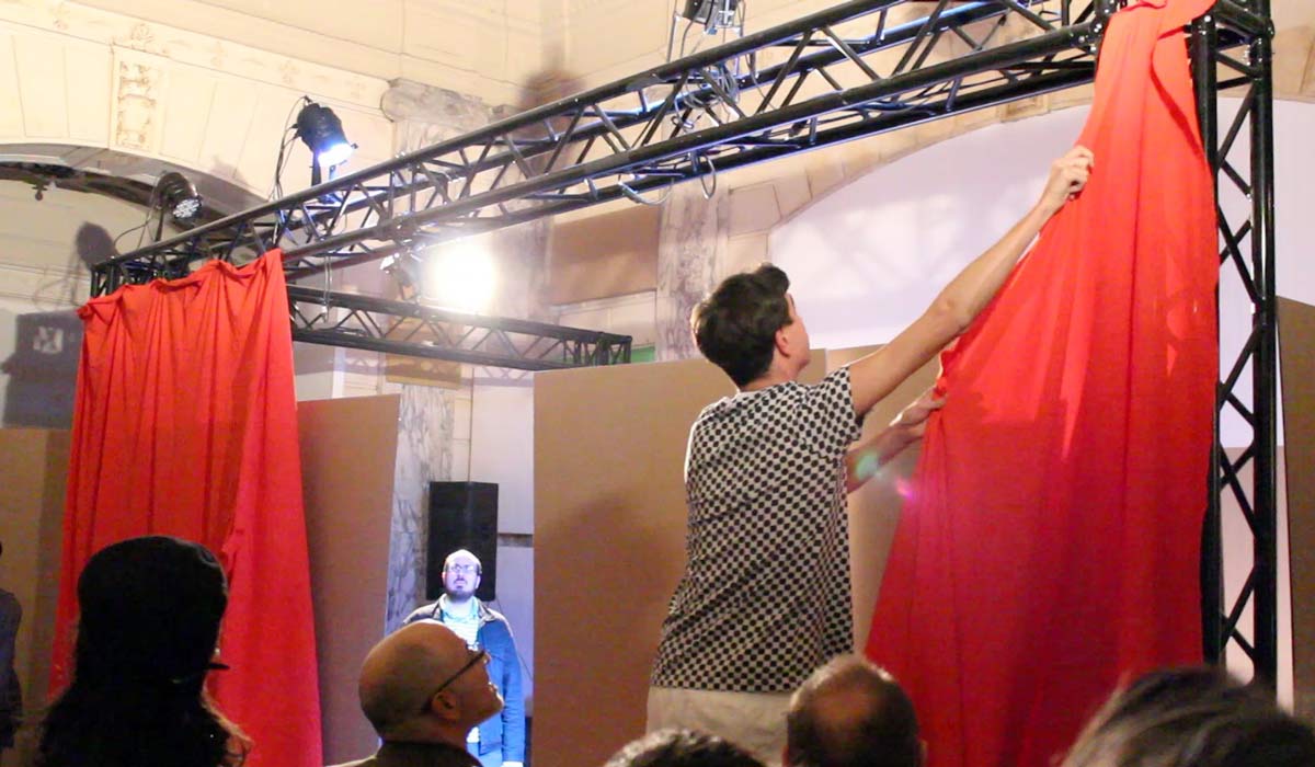 In the performance, numerous gestures are enacted in relation to power in the theatrical space. A stage curtain, an object of division, is brought down to become a rug. Walls become tables, with the piece ending with members of the audience literally around the table.