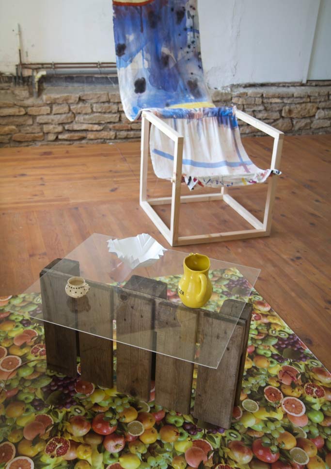 The primary focus of the installation was a chair constructed out of a painting that also functioned as a speaker. Because of its constuction, it was mainly usable for more leisurally activities such as reading and sleeping.