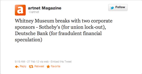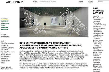 A website, whitney2012.org, was created as a spoof of the actual Whitney site but consisted primarily of a press release announcing that the museum had split with sponsor Deutsche Bank for reckless and fraudulent financial speculation and Sotheby’s for locking out unionized art handlers.